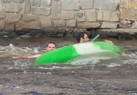 Okolo 8 pro nás přijela dodávka a odvezla nás k lodím. Až do Lenory. Vyfasovali jsme lodě, a kajak a šup na vodu. Šeba jel s Liborem, Laďa s Rudou a Křemil s Koalou. Sandy pádloval sám v kajaku. Asi po 20 minutách na vodě, okusili teplotu Vltavy Křemil s Koalou. Oba nezkušení se otočili na prvních vlnkách, které potkali. Naštěstí přispěchali na pomoc kamarádi a dodali jim energii ve formě tekuté. Pak se postupně obsah alkoholu zvyšoval až gradoval u Ladíka, když se rozhodl nasednout na kajak. Až se tam nasoukal a vyplul, tak si zapálil cigaretku a odpočíval nechaje se unášet proudem. Všichni vyjeli za ním. V jedné zátočině, ale Laďa nezvládnul řízení a vplul pod keře u břehu a vyzkoušel eskymáka. Po poskytnutí pomoci jsme vyjeli dál a šťastně dorazili do našeho prvního kempu Nová pec. V průběhu dne se Laďovi vylila do spacáku skoro celá slivovice do spacáku.V kempu jsme se ubytovali, postavili stany, a šli na pivo. Jednu hospodu jsme zavřeli, a Sandy, Křemil a Ruda šli spát. Zbytek šel ještě na jedno. V hospodě byl muzikant a tak jsme si s ním broukali. Laďa se dostával do ráže a začal mu napovídat text. U písničky Na kolena ne kolena jé jé je, Ladík předvedl svoji taneční kreaci zakončenou na kolenách před muzikantem. Sklidil aplaus celé hospody. Šeba, Libor a Koala zaplatili a šli spát. Laďa ještě pobyl. Rán při vzbuzení jsme se od Sandyho dozvěděli, že Laďa přišel do stanu o půl 6 jen ve slipech a s Ledvinkou. Prý chodil po lese, bosky bez oblečení a byla mu hrozná zima. Jelikož pro nás brzo přijel odvoz, tak jsme nechali Laďove ztracené věci napospas času a přírodě a vyrazili dál. Do vyššího Brodu. Cestou jsme se zastavili u Čertových kamenů. Libor nám pověděl pověst a pak už jsme nastupovali na lodě. Ve Vyšším Brodě jsme si všichni vyzkoušeli šlajznu a jen Koala a Křemil hupsli do vody. Ještě Sandy se otočil s kajakem při přistáváni. Pak jsme pokračovali, až do Rožmberka, kde jsme se najedli, dali pivko a pokračovali směrek k našemu druhému noclehování. Koala zjistil že mu do oblečení vytekl opalovací krém. Po cestě jsme narazili na plovoucí bar a dali si další pivko. Pitný režim je potřeba dodržovat. V klidu js,me pak dorazili do kempu a ubytovali jsme se. Koala, Libor a Křemil se vydali přes řeku na skákací lano a zablbli si. Ráno nás čekala nejkratší cesta, protože jsme jeli jen do Českého Krumlova, který jsme si chtěli prohlédnout. Po cestě byli nějaké šlajzny a první úspěch zaznamenali Křemil a Koala. Neudělali se. V Krumlově jsme vyrazili do města, kde jsme se najedli a napili, koukli na město jak za denního světla, tak za noci. Křemil zakončil svoji návštěvou tohoto města průjmem. Ráno nás čekali hnedle 3 šlajzny v Krumlově. První zase neprojeli jen Koala s Křemilem, druhá proběhla v pohodě a 3, největší raději nejeli. Na kraji krumlova jsme se najedli a pokračovali do Zlaté Koruny. Po cestě se trošku zhoršilo počasí. Poslední šlajzna před Korunou se zdála být v pohodě i Křemilovi s Koalou, ale....., nezvládli ji a tak hups do vody. Až jsme se vybalovali tak teprve koala zjistil že nezavřel pořádně sud a nateklo mu do věcí. Vše mokré. naštěstí si ulil jedno triko do auta, a jako zázrakem tepláky se nenamočili. Tak jsme odevzdali lodě, šli se najíst do hospody a vyrazili k domovu. Po cestě nám pršelo, a nám se povedlo skoro projet duhou. Domů jsme dojeli okolo 20 hodiny.